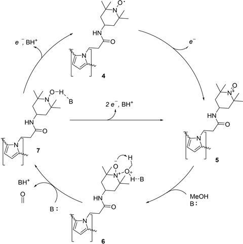 The researchers used the well-known alcohol oxidant TEMPO (2,2,6,6-tetramethylpiperidinyloxyl), a radical that is regularly used as a homogeneous catalyst in organic chemical reactions. One advantage of TEMPO is that it prefers to oxidise alcohols rather than carbonyl groups. they grew a polymer film on the support electrode and anchored TEMPO to it with a pyrrole group. This makes TEMPO a heterogeneous catalyst.
